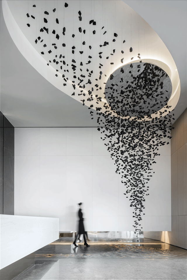 設(shè)計師在理解該裝置“文化與自然關(guān)系”的語匯基礎(chǔ)上,從懸浮木炭的材質(zhì)聯(lián)想到傳統(tǒng)五行之道中“水生木、木生火”的原理,設(shè)置層次交疊的天花模擬室外天空的晴態(tài),將藝術(shù)裝置處的地面作拋光大理石水紋面處理,在鏡面的顯映下,水的流相不斷延伸,亦與相鄰水院產(chǎn)生意象層面的對流、連接,表達萬物自由向上的精神意境。