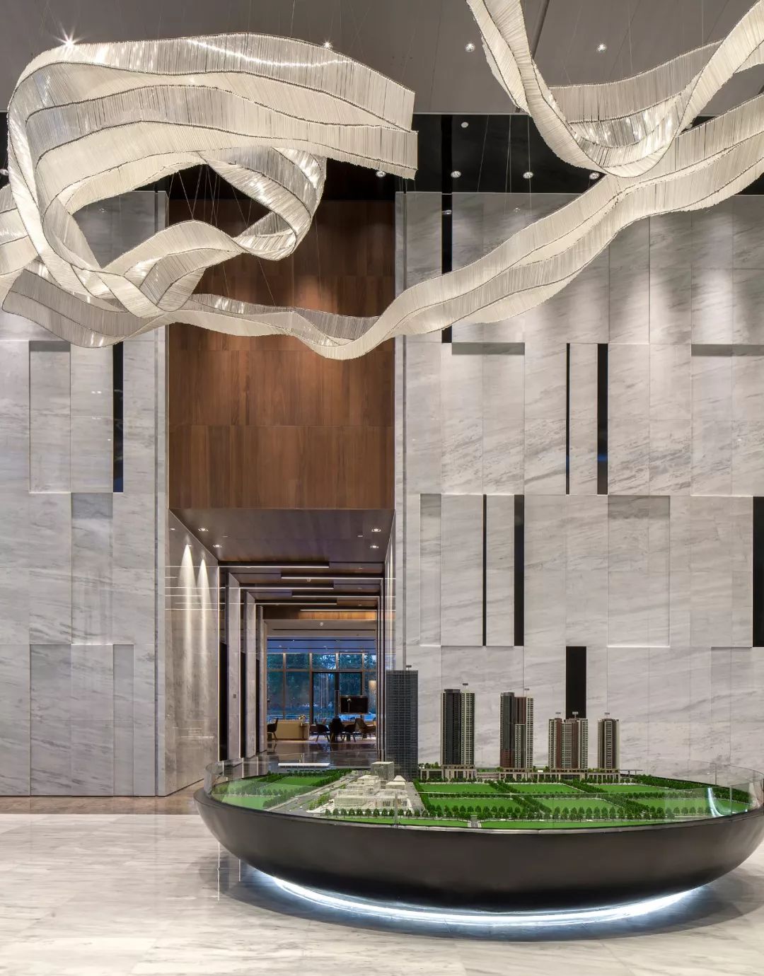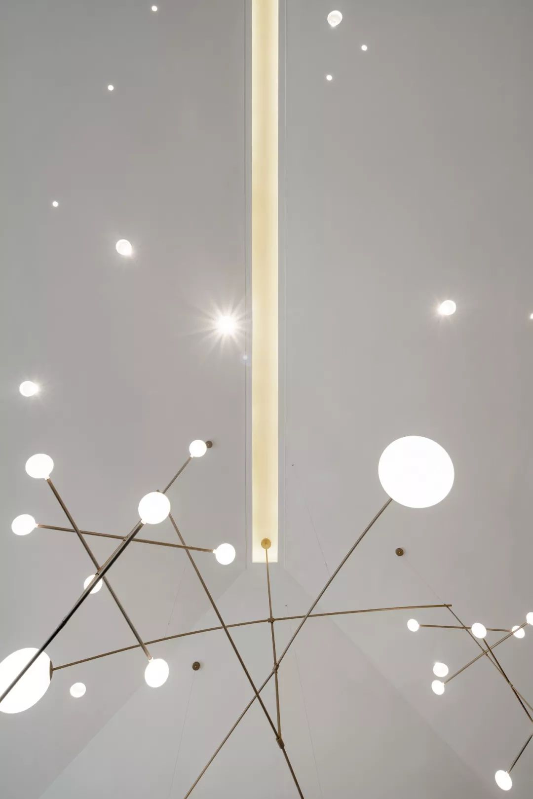 沙盤區(qū)燈飾的抽象線條似樹枝般旁逸斜出、纖細靈動,其設(shè)計靈感來源于亞歷山大·考爾德的動態(tài)雕塑“Snow Flurry”,隨著空氣的流動,不同視角下燈飾形狀各異,類比日月星辰在內(nèi)的宇宙平衡關(guān)系,總能給人帶來新奇感,亦是詩意與藝術(shù)的格調(diào)升華。