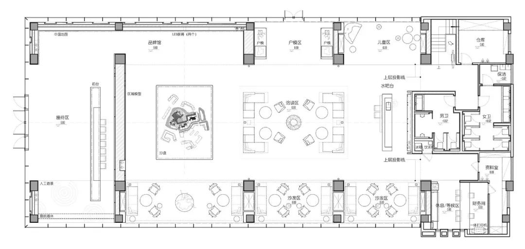 洽談區(qū)大廳的天花設(shè)計,采用簡化的坡屋頂建筑形制,在脊件線條處飾以燈帶,強化空間的幾何層次感。設(shè)計師在光潔的坡屋頂上,以天花鏤洞50mm深的方式內(nèi)嵌不同規(guī)格的射燈,模擬一顆顆閃爍著光芒的星辰,人的視線將它們連點成線,組成一片星空,延續(xù)沙盤區(qū)燈飾關(guān)于宇宙星辰的線索。