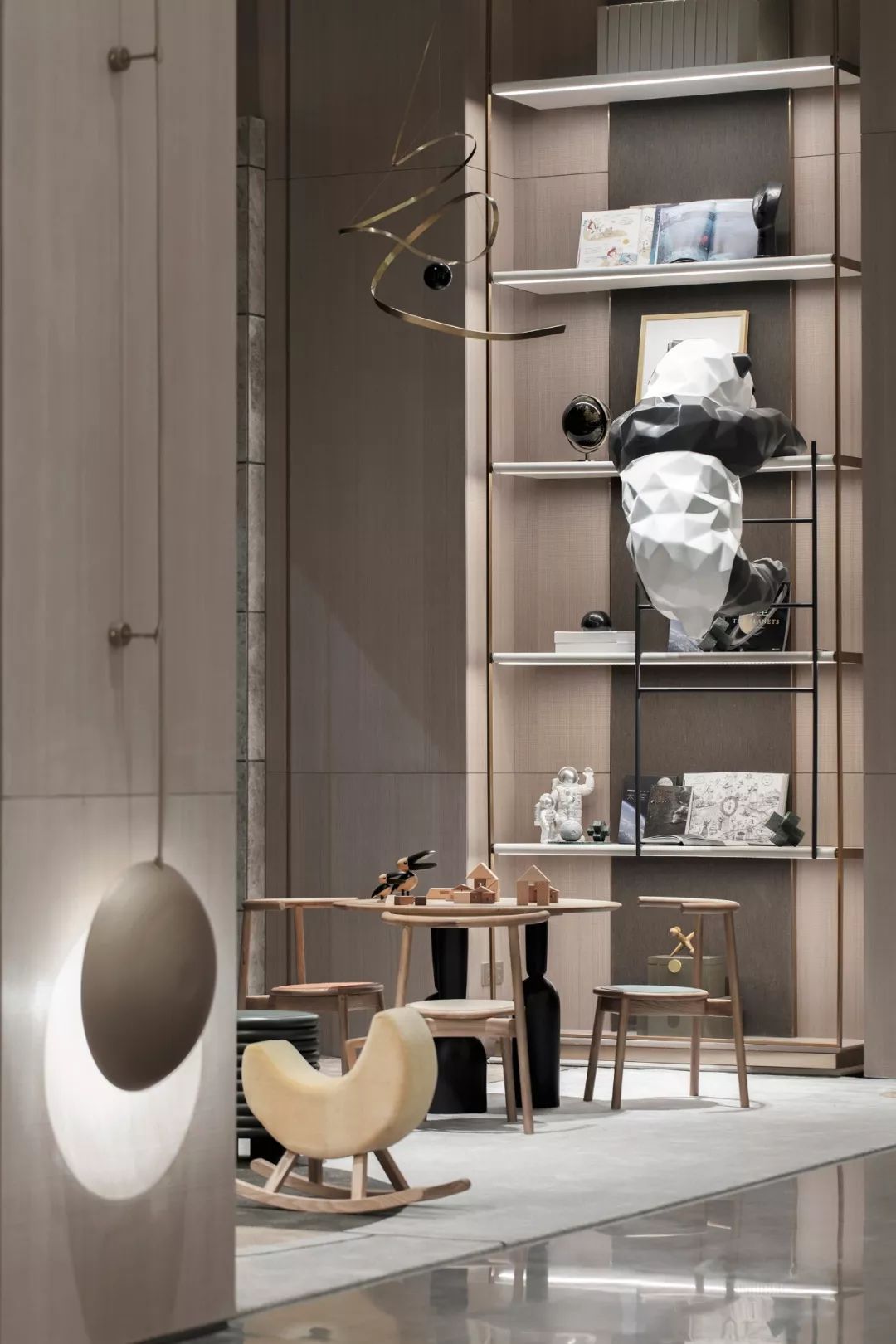 兒童區(qū)仍由宇宙星空元素裝點,同時加入以全球知名藝術(shù)家Lawrence Argent創(chuàng)作的巨型大熊貓裝置“I AmHere”的縮略版,以及法國竹置藝術(shù)家 Laurent Martin設(shè)計的竹雕藝術(shù)品 ,打造出一個可供孩童安靜閱讀、快樂玩耍的樂園,任其盡情遨游在探索星空的遐想之中。