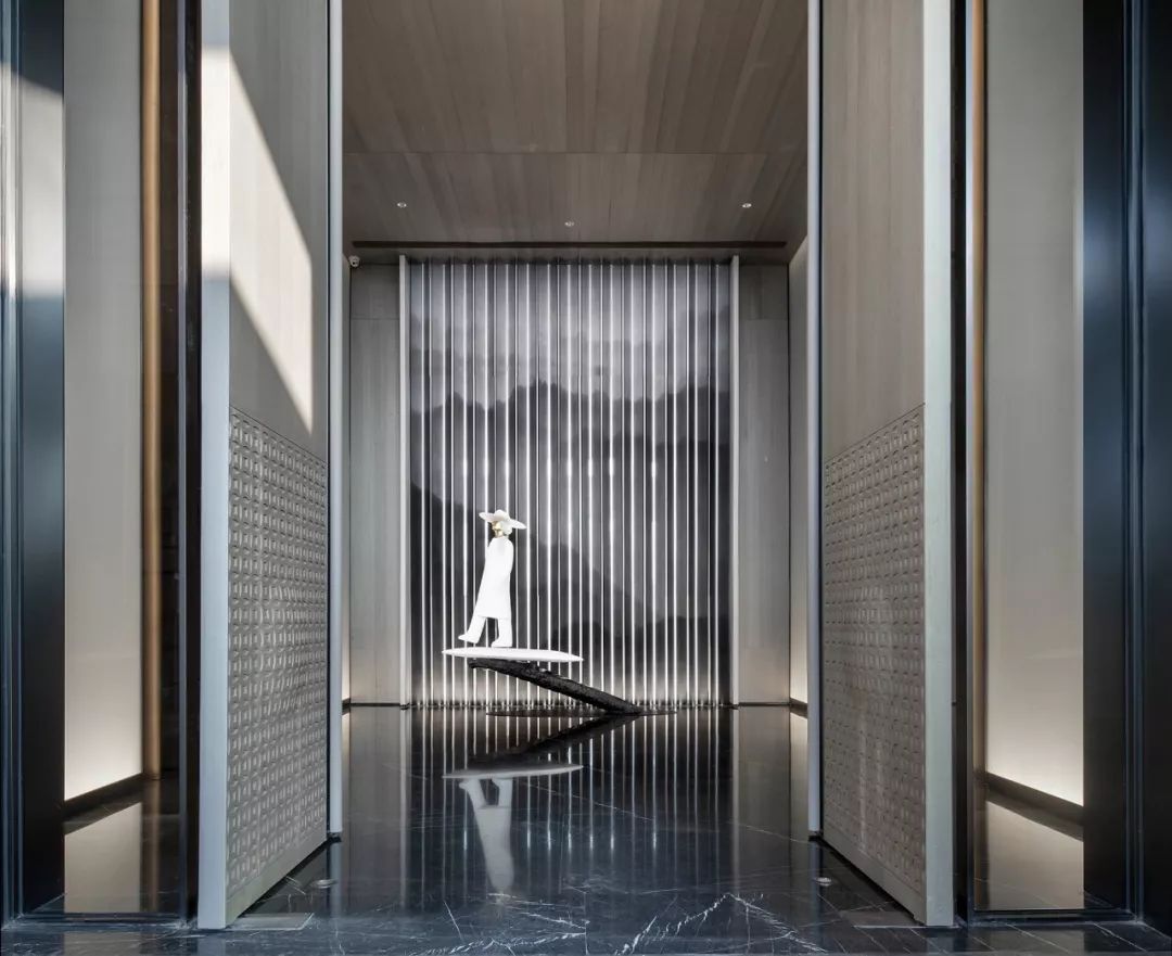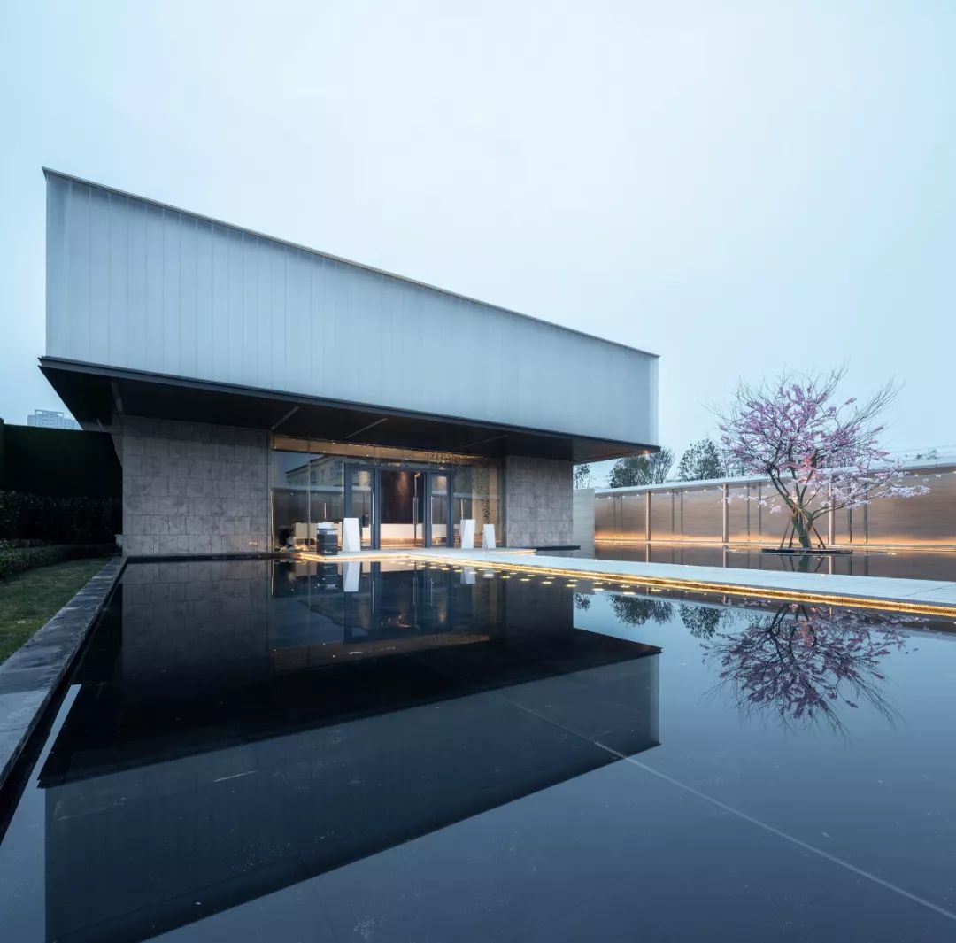 細密格柵交疊錯落,一如龍泉山脈的連綿起伏狀,寫意一番縹緲逸致,又疊加真石、活水泛趣,使得外觀設(shè)計融入山水的縮影,在虛與實之間實現(xiàn)詩意定調(diào),打造云煙氤氳、若隱若現(xiàn)的水院光景。
