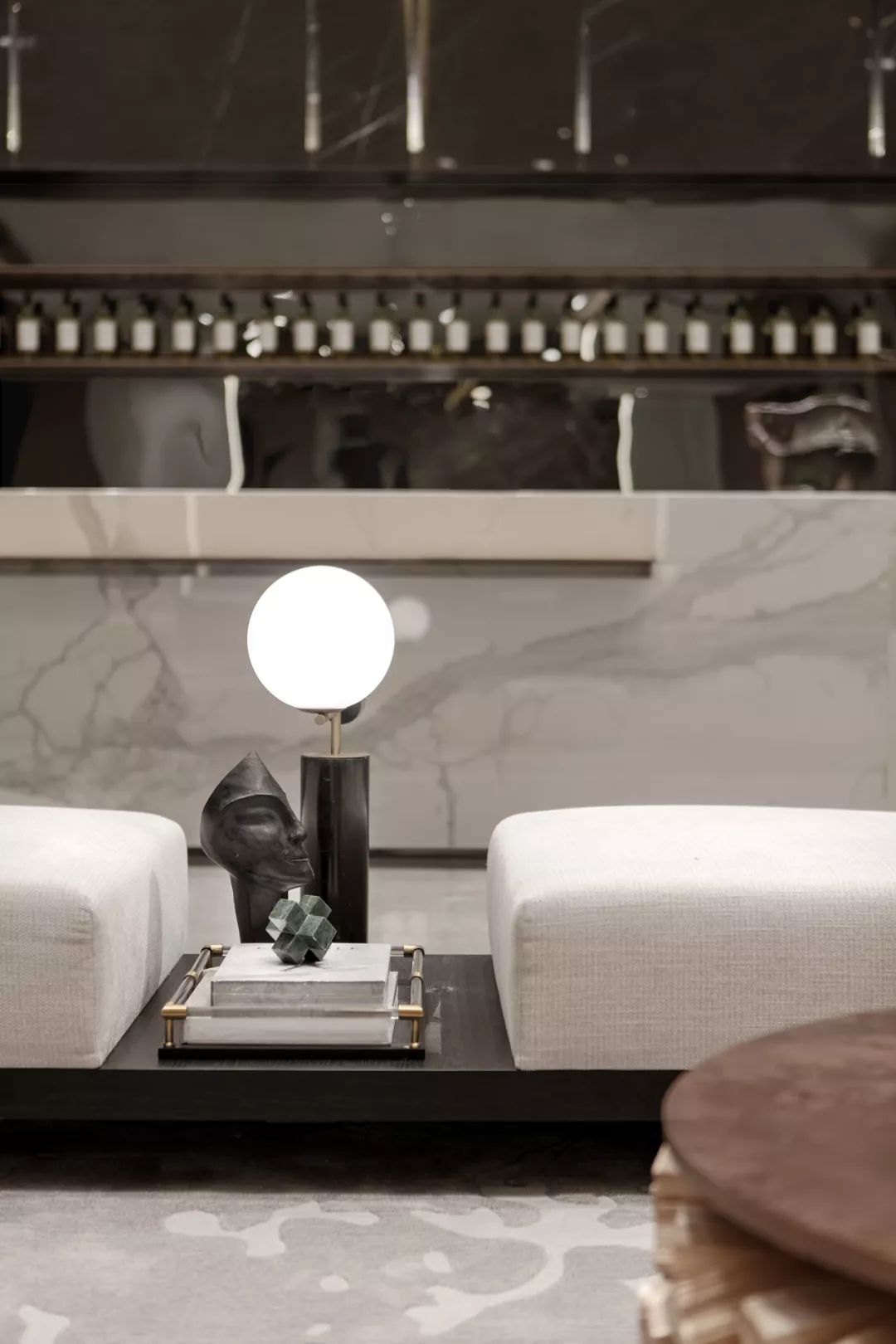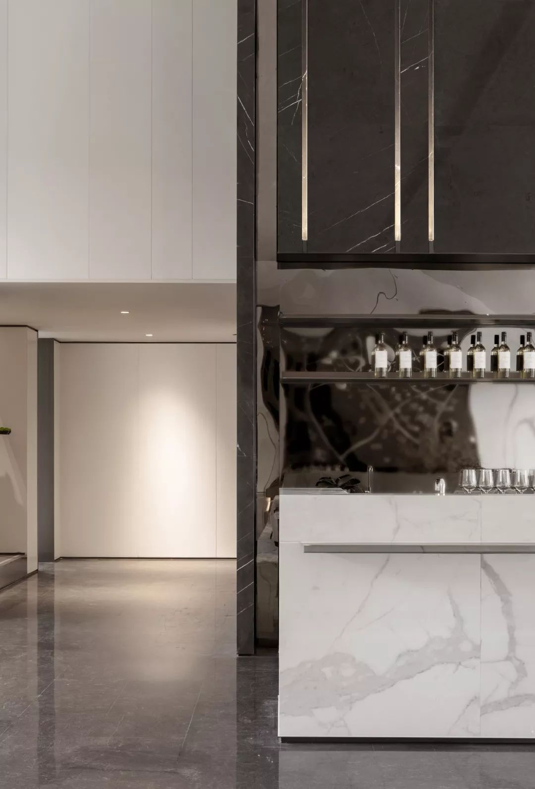 水吧區(qū)背景墻呈珊瑚灰調(diào),與雅白色的吧臺形成深淺調(diào)的對比,在大理石材質(zhì)下,于紋路脈絡(luò)上延展留白的臻致美學,呈現(xiàn)出簡約大氣的藝術(shù)調(diào)性。