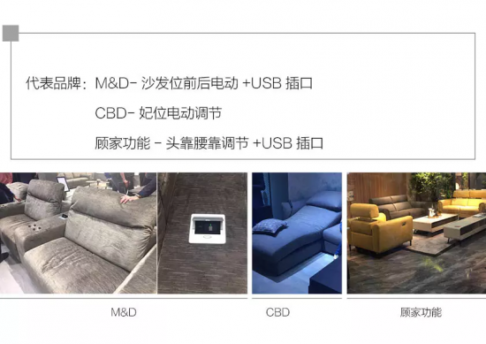 當(dāng)然,智能家居不僅在寢具領(lǐng)域,沙發(fā)產(chǎn)品也沒有落下。例如沙發(fā)電動(dòng)功能位的出現(xiàn)更加頻繁,并且變化的范圍更多,除了傳統(tǒng)的腿部抬高功能外,開始出現(xiàn)座位前后調(diào)節(jié)、上下調(diào)節(jié)的功能;通過(guò)功能五金以及與遙控裝置的對(duì)接,頭靠與腰靠的調(diào)節(jié)更加多元及便利;USB等智能接口全面普及等等。