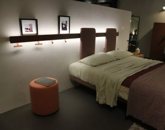 caccaro更是直接顛覆了大眾對床類產(chǎn)品的固有思維,床屏由兩塊獨立軟包構成,同時向一側延伸出置物架和掛鉤,并內藏音響和燈帶,更加新潮。