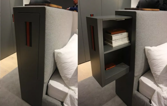 以軟床產(chǎn)品為例,jesse sitland的這款床看似普通實則內有玄機,在床屏兩側內置儲物功能,輕松拉出即可取放物品,省去了床頭柜,同時拉手的元素與背后的衣柜遙相呼應。