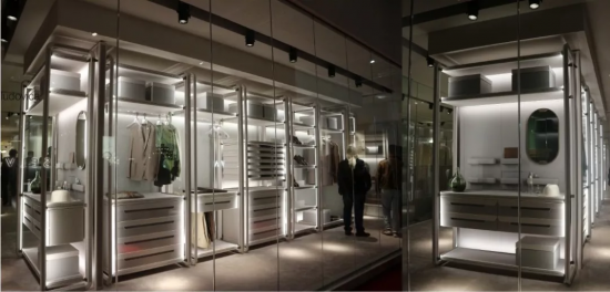 以衣帽間為代表的大型柜類系統(tǒng)一直是米蘭展上的重頭戲,這起源于歐洲的精致生活理念對國內也產(chǎn)生了舉足輕重的影響,但于國內品牌而言畢竟是舶來品在真正的實用性方面還有所欠缺。作為國外品牌最為成熟的產(chǎn)品品類之一,不管是柜類產(chǎn)品內部的功能分區(qū)、燈光的設計還是細節(jié)的處理,品牌都能夠從使用角度出發(fā)真正響應消費者的訴求。