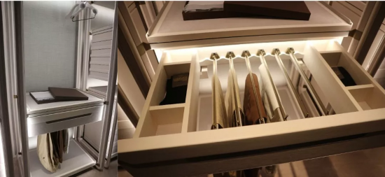 ludovica的這款衣帽間在正反及兩側的四個方向均有不同的功能分區(qū),各種精美功能件的配置虛實結合,通體內置燈帶且隱藏式設計,在每一個細微之處無不體現(xiàn)著人性化。