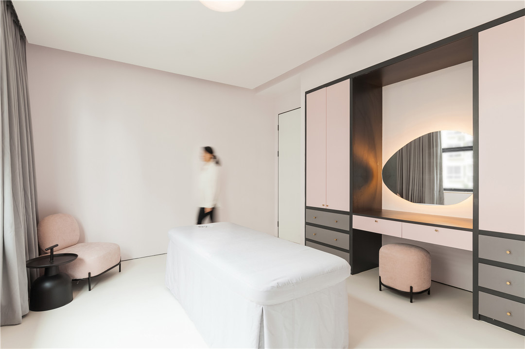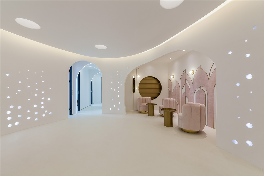 本次獲獎作品《lady mooi 女子醫(yī)療美容機構》其靈感源自兩歲女兒的睡前故事,設計摒棄了以往該類型空間所采用的慣常的符號化做法,以“人魚公主”的故事為設計靈感,提取氣泡、水等夢幻元素,營造輕松、舒適、浪漫的環(huán)境,讓愛美的顧客們在這里有仿佛置身夢幻水世界的感受。一圈沖孔板從下往上、由大到小不規(guī)則排列,仿佛海底世界的氣泡,簇擁成柔軟、純凈的橢圓形空間。過道用燈帶鑲嵌半弧形攻門,錯落之間,一步一世界,那份變身的莊重在魔法的推演中漸漸實現(xiàn)。