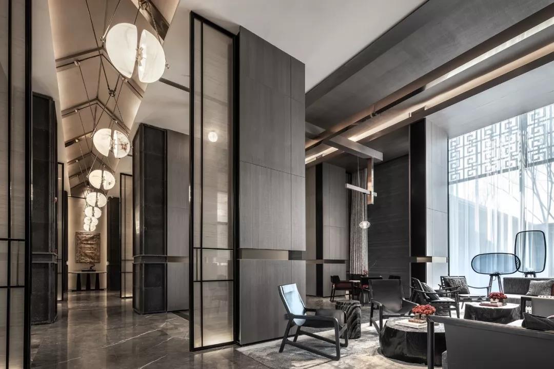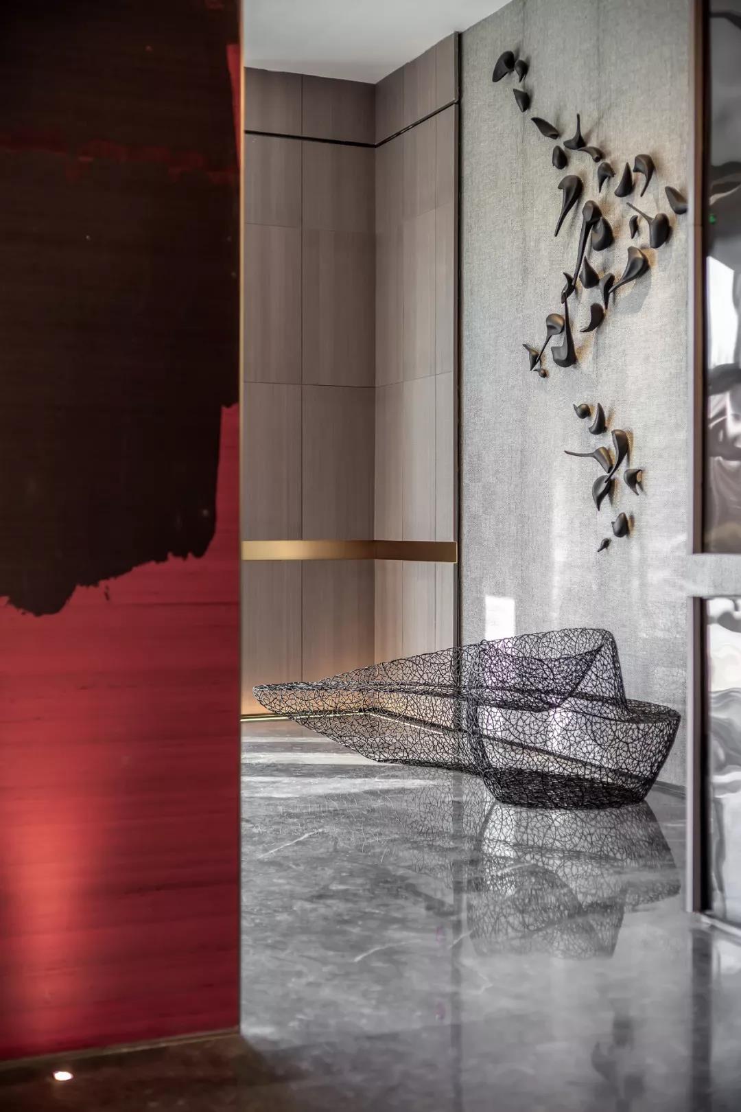 傳統(tǒng)觀感下的朱砂紅、墨黑與金色,和空間中使用的大理石、黃銅與木材堆疊穿斫,在悄無聲息中拉長了時空距離。錯落別開的屏風上濃重的一筆墨跡,凸顯灑脫東方藝術(shù)視像。一旁休息座椅的編織鏤空形制透著空氣感,抽象的鳥獸意象在墻面飛散開來,空間語言在生動的敘事性中產(chǎn)生不凡的震撼力。