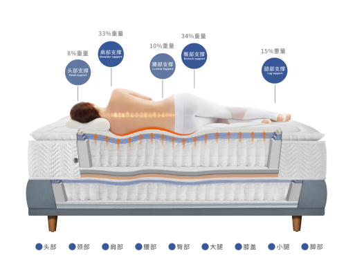 大家都知道寢具最關(guān)鍵的就是:彈性支撐系統(tǒng)。有彈性才能將身體較重或凸起部位(如肩膀、臀部)對床的“下推力”,主動轉(zhuǎn)變?yōu)?ldquo;反推力”,以支撐身體其他較輕或凹陷部位(如腰部、腿部),其靈活多向的反應(yīng)特性,無論男女老少,高矮胖瘦,何種睡姿,都可以依據(jù)人體各部位曲線及重量不同,自動提供舒適、健康的睡眠生理曲線。