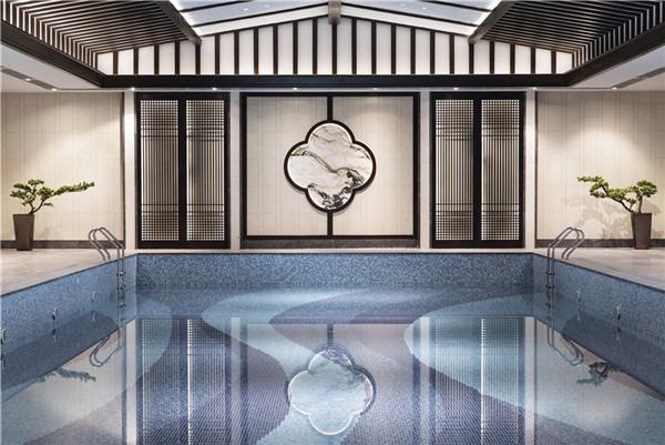 古建天花形制下,游泳館延續(xù)窗欞的框景手法,以海棠紋窗欞框就一幅大理石材質(zhì)的山水意景畫,柳條紋格柵則對(duì)仗分布兩側(cè),斑駁光影透漏而出,寫意影影綽綽的線條形制美,呼應(yīng)整個(gè)空間的中式意蘊(yùn)。