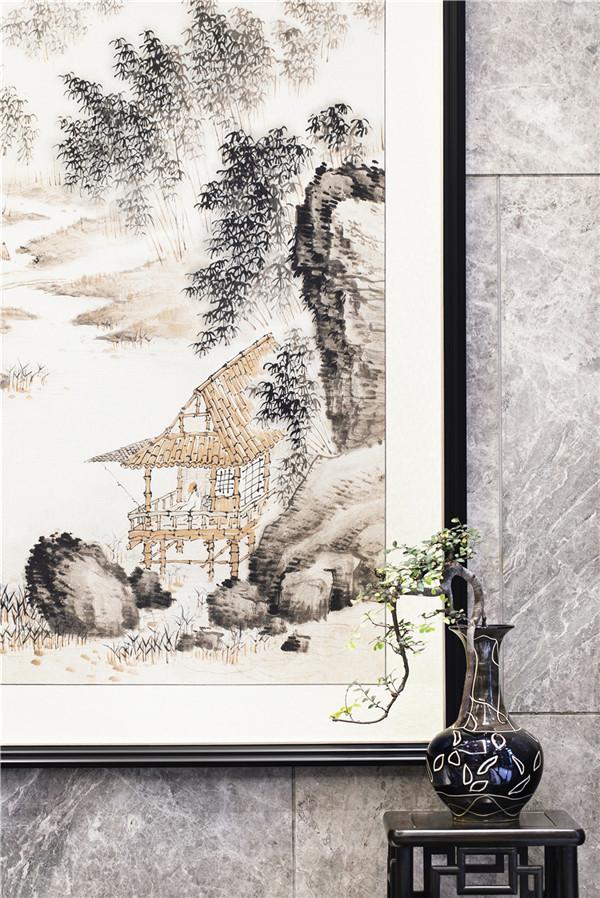 移步下階,見水墨山川順沿蜿蜒周折的樓梯走勢(shì),盤旋錯(cuò)落。云霧縹緲間,紅楓葉落,勁松蒼翠,山巒疊嶂,意境雅雋。山石與蒼松的精巧端景,映襯著山水畫的意境,人文自然的隱逸美散落在虛實(shí)之間,自在由心。
