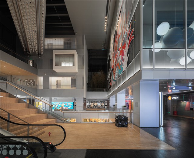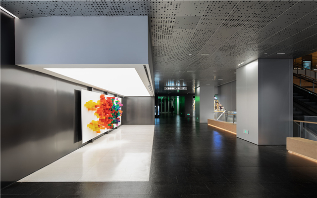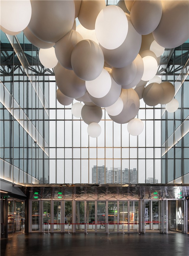 本案的燈光設(shè)計,便是延續(xù)了建筑的風(fēng)格與氛圍定位,在結(jié)合中庭自然光線的基礎(chǔ)上,設(shè)計師打造一個橫貫中空格局的大型燈飾藝術(shù)裝置,堆疊的白色球狀燈體與飾物渾然一體,串聯(lián)起空間內(nèi)最為突出的視覺重點,散發(fā)著瑩瑩點點、皎潔明朗的光芒,展呈出迭代美學(xué)視像的感官效果,與建筑體量、室內(nèi)氛圍極佳地結(jié)合在一起。
