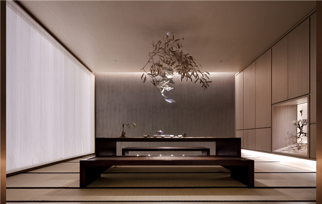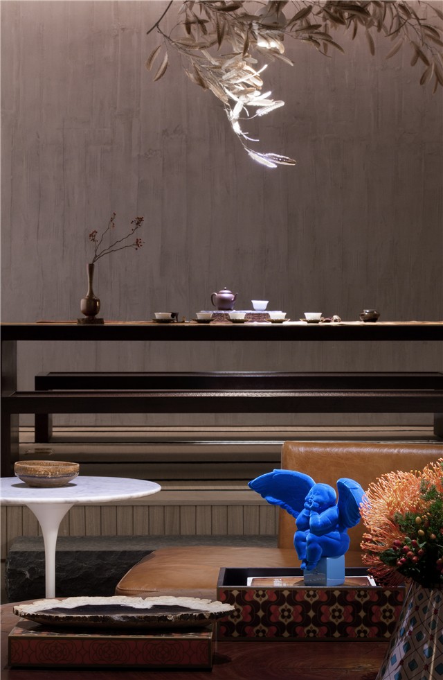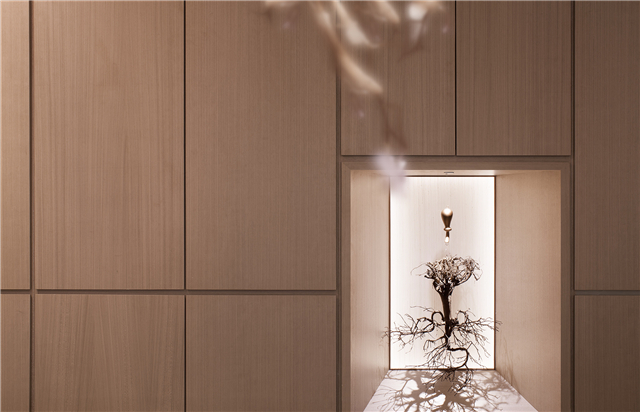 燈光設(shè)計上含蓄而低調(diào),燈帶潛藏在墻體內(nèi)里及邊緣處,跳脫出常規(guī)的光感節(jié)奏,設(shè)計師根據(jù)空間關(guān)系所需匹配各式燈光裝置,將光與空間、飾物構(gòu)成的小范圍關(guān)系轉(zhuǎn)化成為藝術(shù)層面的視覺美感。東方雅韻與西方情致,在溫煦柔和的燈光映照下,模糊了東西之間的界限,加深了生活與人情的意趣。