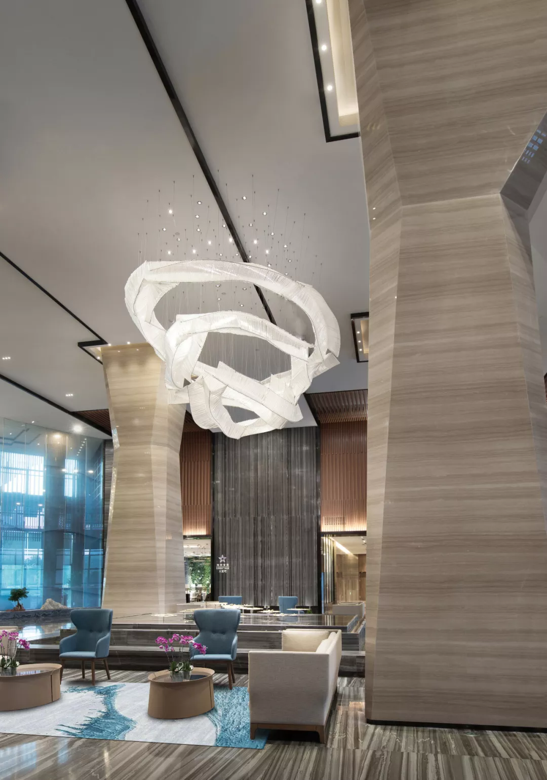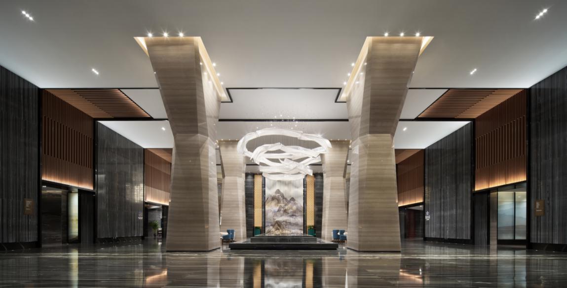 燈具使用了水晶玻璃的材質(zhì)制作,巧妙的讓光線營(yíng)造出云霧繚繞的氛圍,又給整個(gè)大堂空間增加了些許靜謐的氛圍感,更是符合了“小隱于野,大隱于市”的道家哲學(xué)思想。