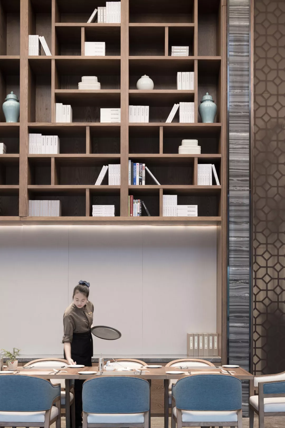 燈具部分的設(shè)計(jì)結(jié)合了自然光的影響,讓兩種光源和諧的交織在一起。在不同的外部光源照射之下,呈現(xiàn)出的光影效果是截然不同的。配合上藍(lán)色配色的軟裝潢與高度得當(dāng)?shù)臒艟?,整個(gè)餐廳也仿佛處于了一個(gè)古今的夾縫之中。木格柵寫意地表達(dá)了山水氛圍,中式木質(zhì)花格提高了整體符的意境,為整個(gè)空間在不經(jīng)意間附上了一點(diǎn)點(diǎn)禪意。