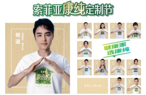 活動前期,每一位索菲亞康純大使都身穿印有“索菲亞康純板”和“健康家,選康純”口號的白色文化衫,雙手指尖并攏,放在胸前擬作屋頂?shù)男螤?,詮釋著將與索菲亞一起致力于呵護家庭健康,共筑美好家的愿景,呼吁大家一起加入共同為健康環(huán)保的家居生活而努力。