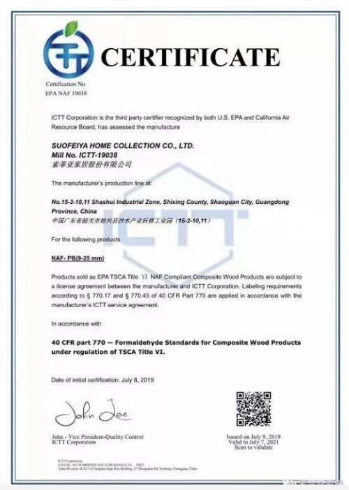 在2019年7月,索菲亞康純板刨花板板芯順利通過檢測,獲得美國環(huán)境保護署(EPA)無醛豁免認證——EPA NAF,這是康純板板芯高環(huán)保等級的有力證明。