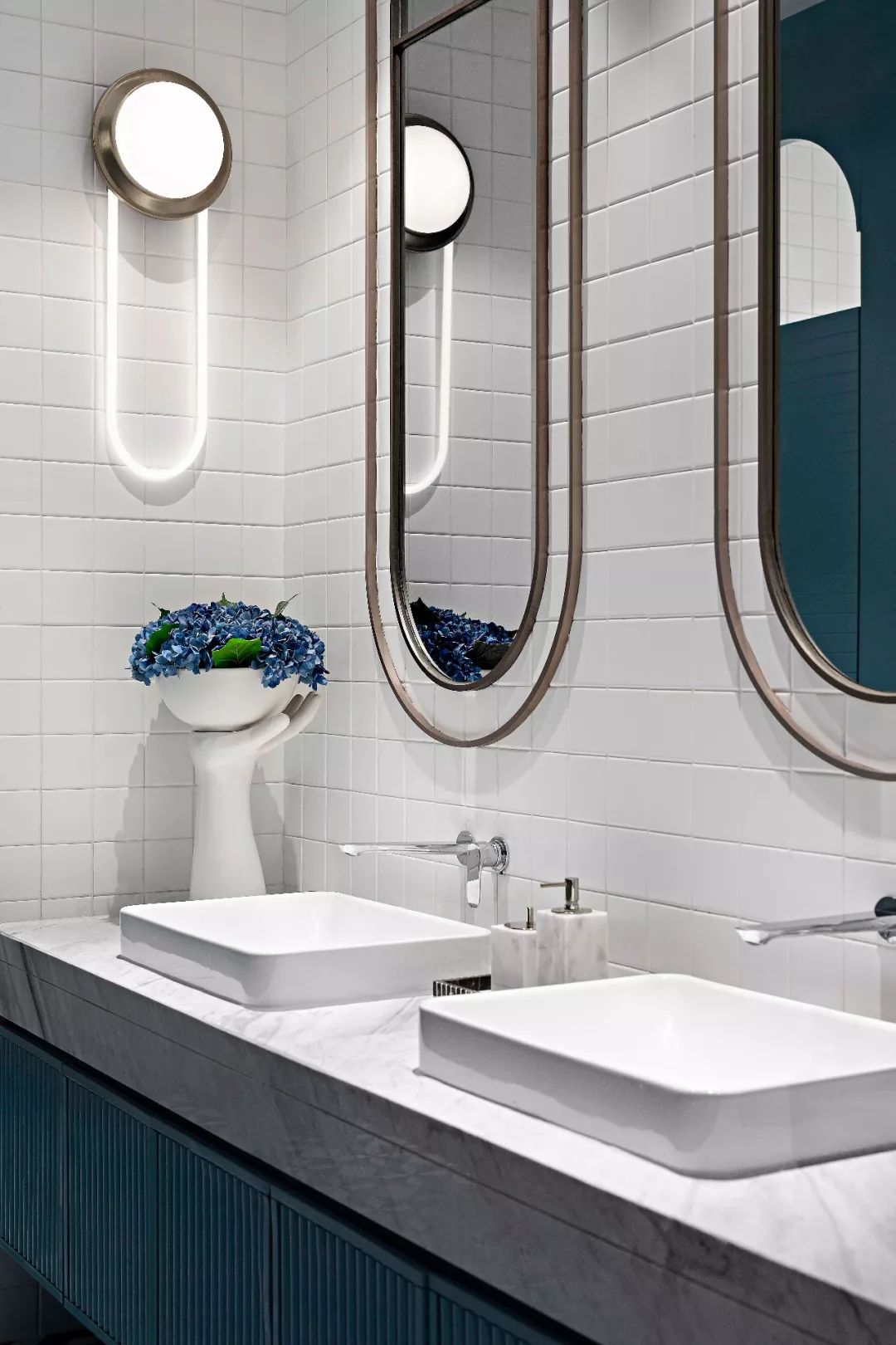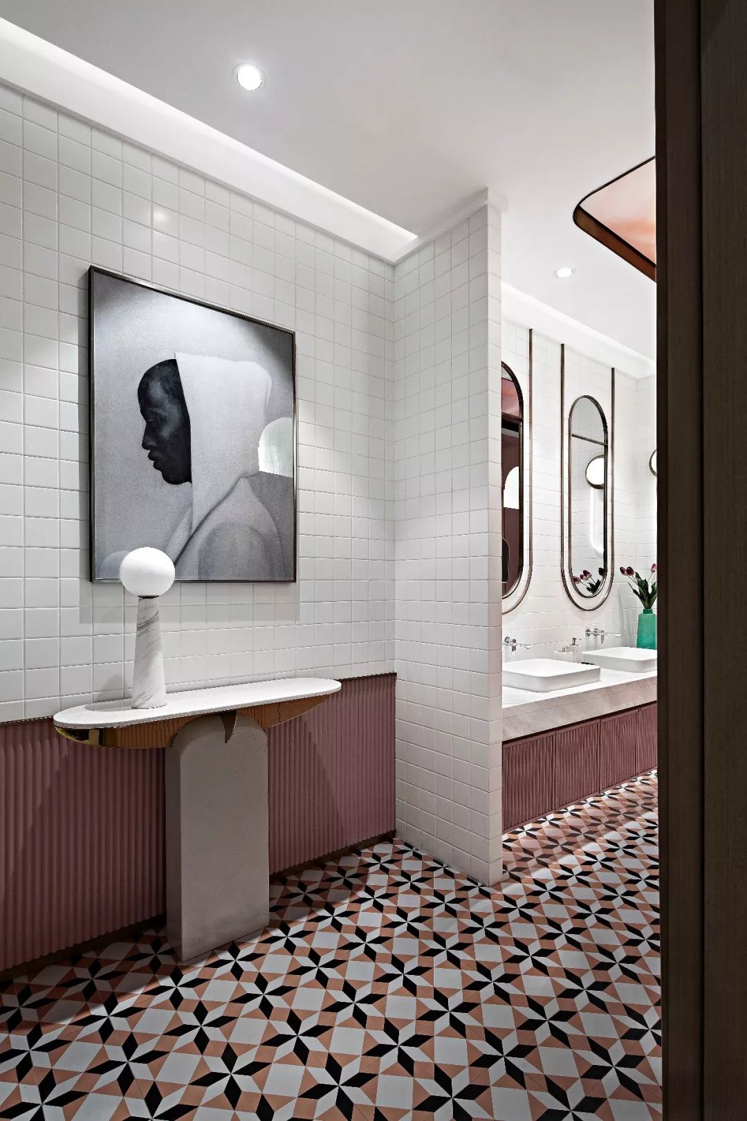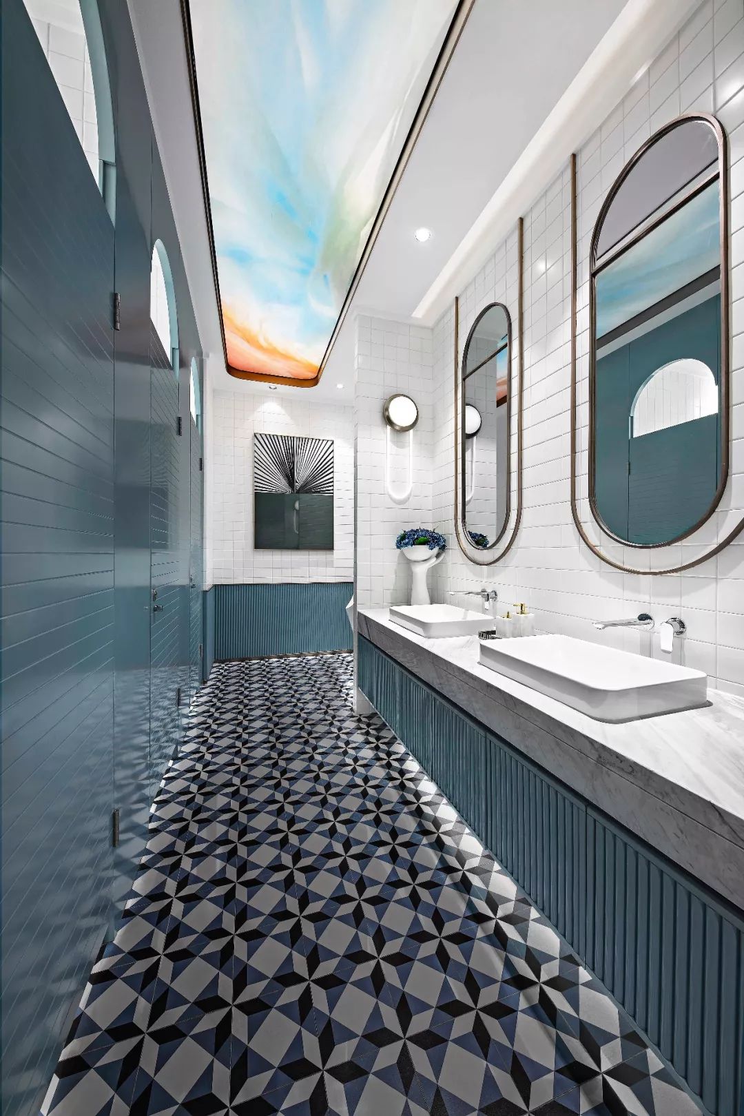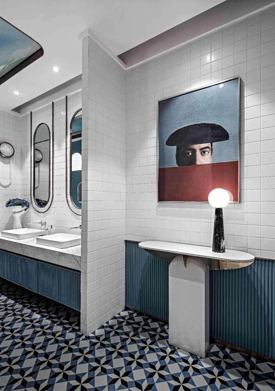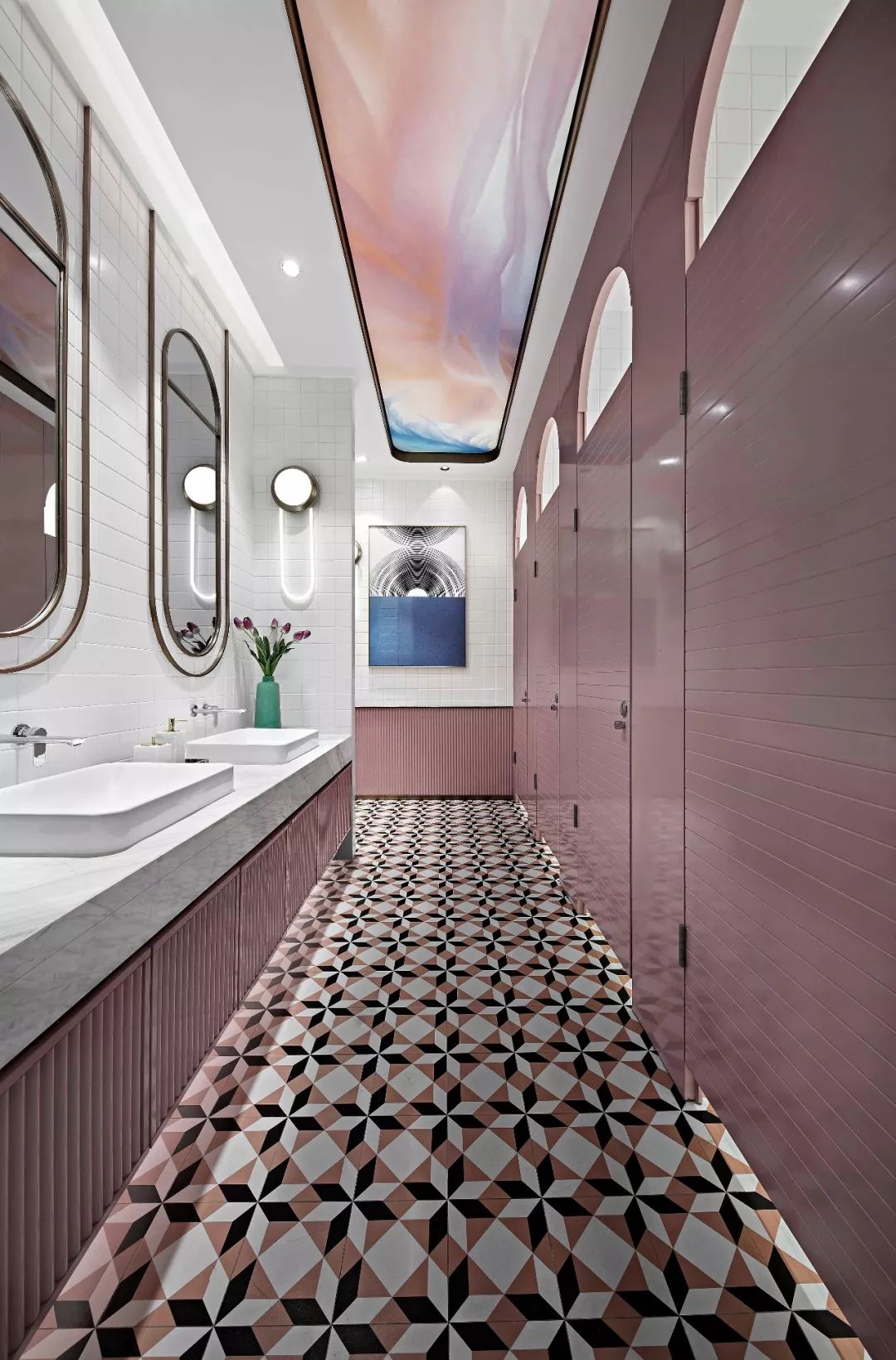 洗手間的折線運用達至高潮,直線、曲線、幾何體...各種形態(tài)的線條共處一室,以線、面、體的綜合形式進行空間形態(tài)的表達,從平面到立體自然轉(zhuǎn)化。大面積的純色色塊制造一種強烈的心理震撼力,營造張揚有力、現(xiàn)代時尚的空間意境。