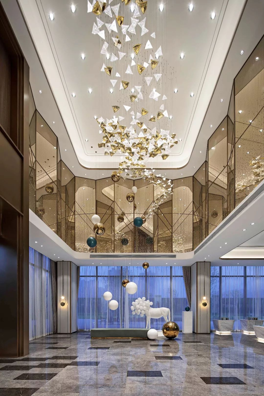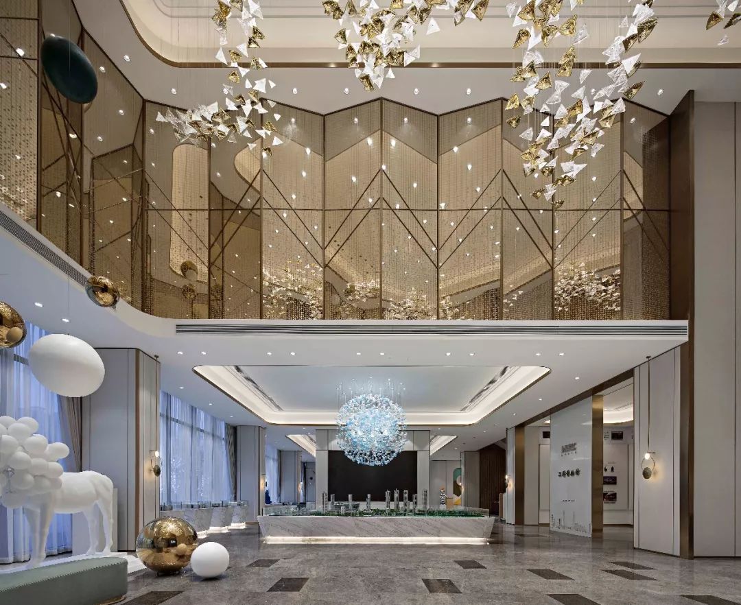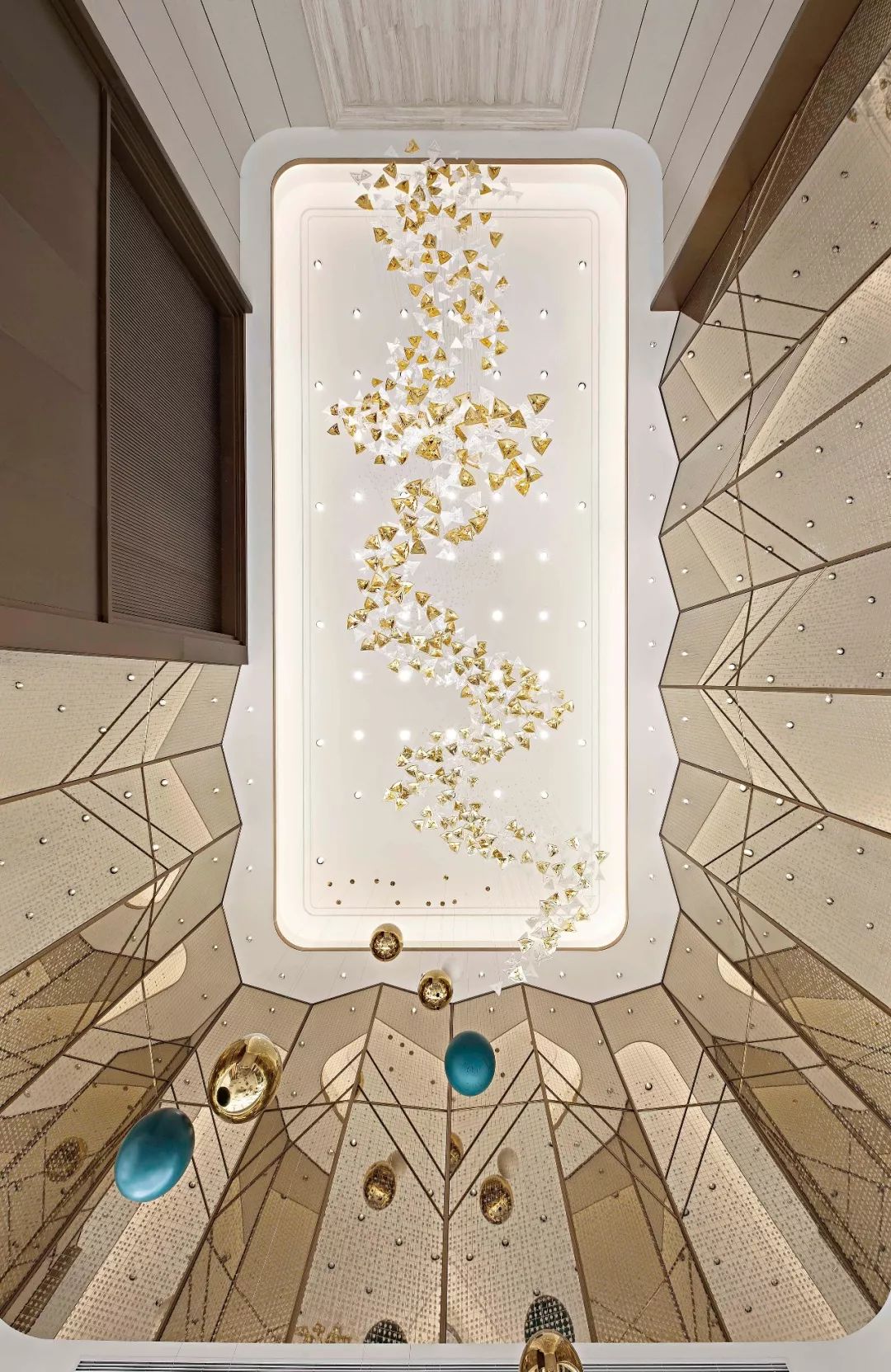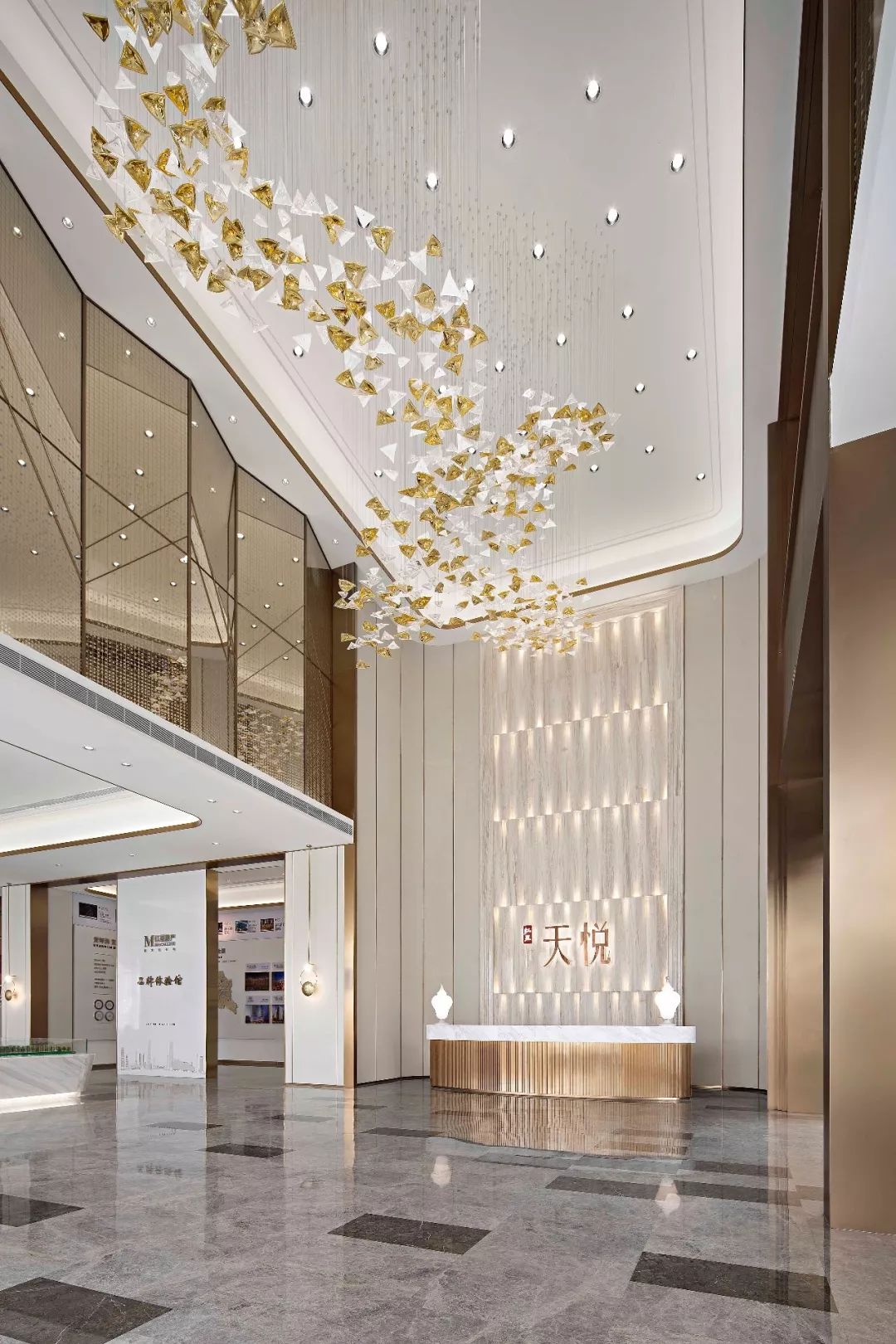 金色與透明相間的幾何水晶吊燈,看似無序?qū)崉t規(guī)律地串聯(lián)起一個灑脫、未來感十足的現(xiàn)代酷炫空間印象,與接待臺背景墻燈光、墻面裝飾線條以及接待臺立面造型的規(guī)律秩序形成視覺上的互補,讓觀者不斷地產(chǎn)生期待與驚奇。