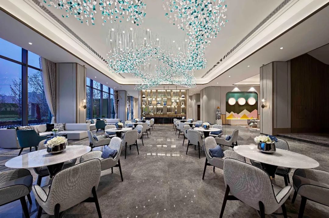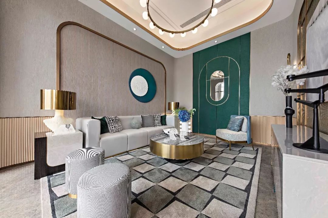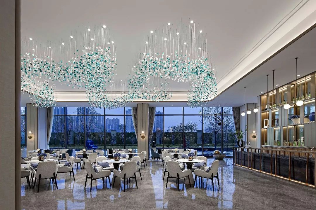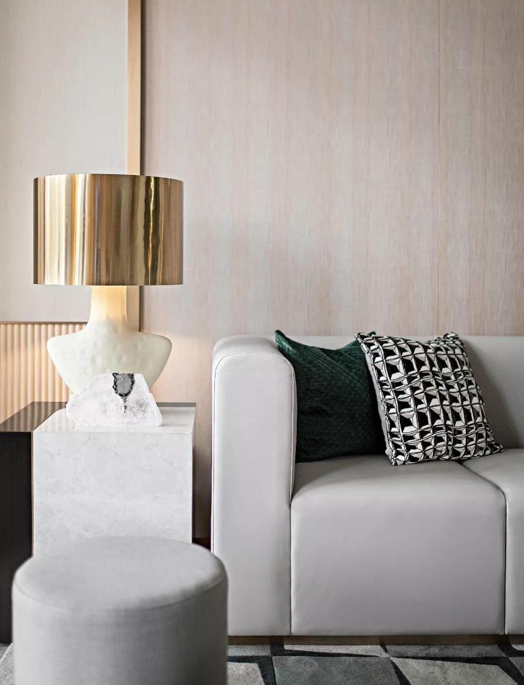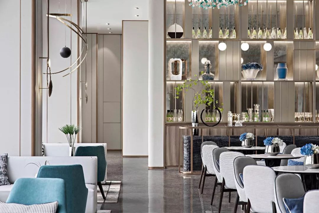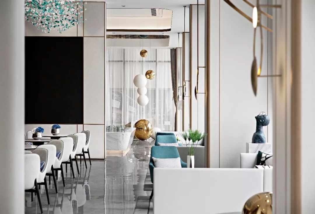 洽談區(qū)奶白的色調(diào)勾勒簡潔、寧謐的商談氛圍,翡翠綠與透明小水晶疊合而成的裝飾吊燈,星光點點,觥籌交錯。有序的線條適度糅合,豐富了空間的層次,浪漫感與文脈精神合為一體,增加空間的藝術(shù)感染力。