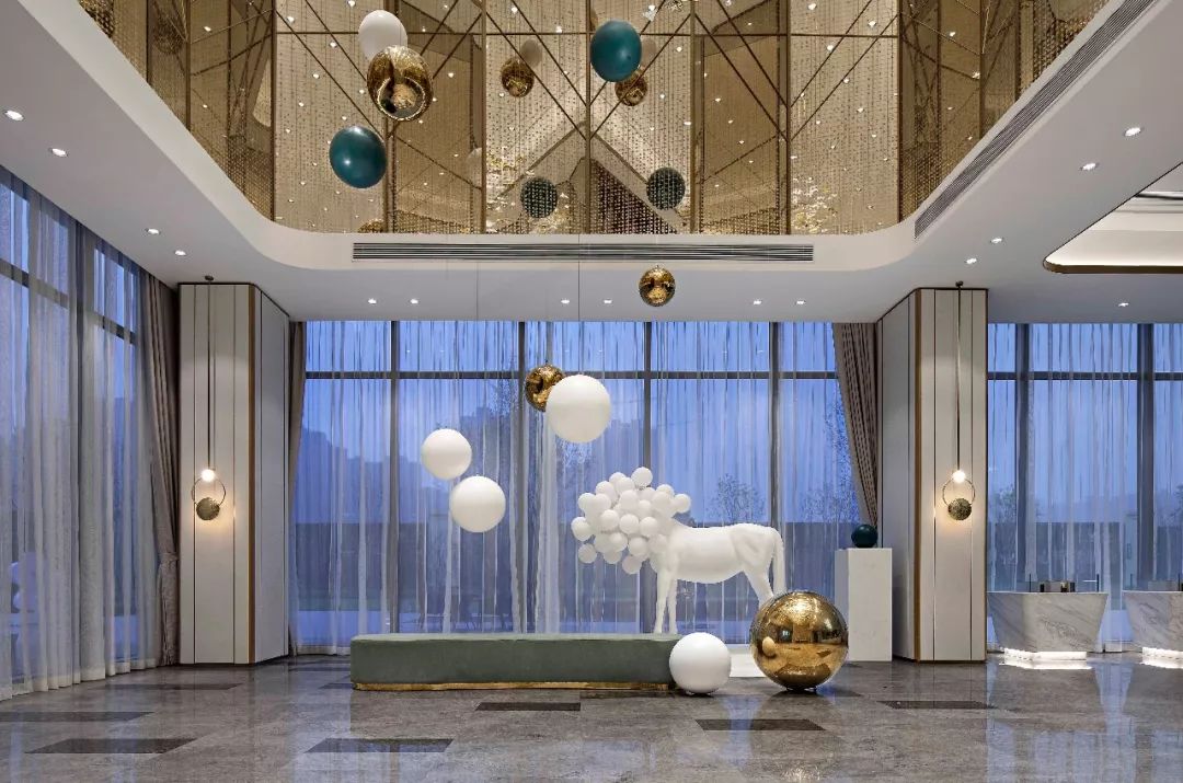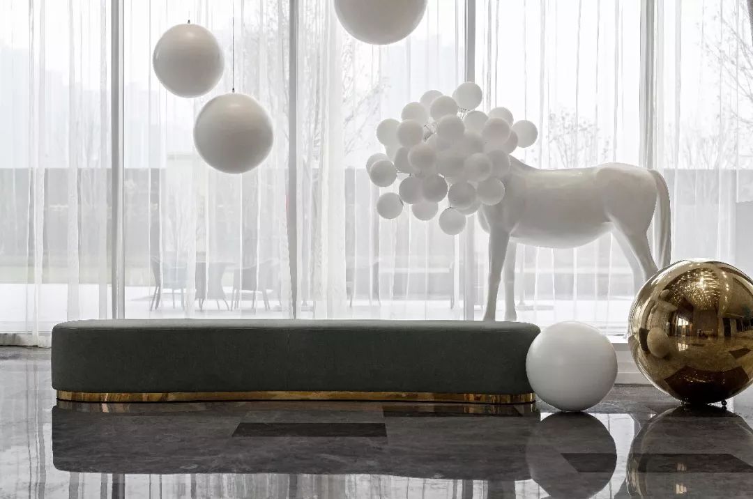 大小不一的圓形彩球靈活了空間的氣質(zhì),多變的設(shè)計形態(tài),凝結(jié)成一種全新的空間尺度,與趣味藝術(shù)的動物造型擺件,為空間創(chuàng)造了多種可能性。