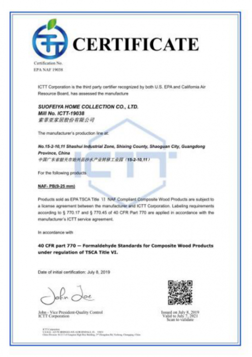 憑借出色的環(huán)保性能,康純板不僅獲得了美國環(huán)境保護(hù)署頒發(fā)的EPA(NAF)無醛豁免認(rèn)可,代表康純板基材出口美國對(duì)甲醛釋放量的項(xiàng)目免檢;同時(shí)也獲得了林產(chǎn)工業(yè)協(xié)會(huì)的無醛人造板及其制品的認(rèn)證,說明在制造過程中沒有添加甲醛成分。