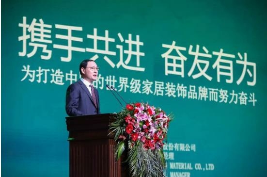 ▲德華兔寶寶裝飾新材股份有限公司總經(jīng)理 陸利華 作“攜手共進(jìn),奮發(fā)有為”主題報(bào)告