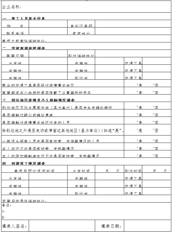 ?企業(yè)已建立每個員工“一人一檔”,對員工行動軌跡和健康進(jìn)行篩查和管理。有全體員工“一人一檔”調(diào)查表,形成檔案備用。表格應(yīng)含有姓名、性別、身份證號碼、年齡、籍貫、聯(lián)系方式等基本信息,以及該員工2020年春節(jié)前后至今的行動軌跡,包括以下重點關(guān)注事項,樣式參照附件3,企業(yè)可根據(jù)自身實際調(diào)整;