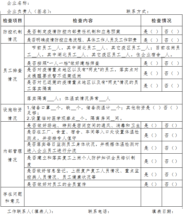 1、自檢自查。企業(yè)對照“四個到位”“8個一”的要求,落實疫情防控措施,工作人員填寫《企業(yè)復(fù)工復(fù)產(chǎn)防疫措施對照表》(附件1),由企業(yè)負(fù)責(zé)人簽字。