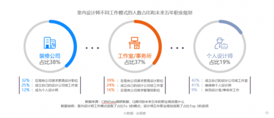作為創(chuàng)意產(chǎn)業(yè)從業(yè)者,室內(nèi)設(shè)計(jì)師在工作模式上的選擇更為自由,無論是“背靠大樹”還是“自立門戶”,都有更廣闊的選擇空間可以輸出自我的設(shè)計(jì)風(fēng)格和理念。CBNData《報(bào)告》顯示,目前在裝修公司以及工作室就職的員工,超過三成計(jì)劃在現(xiàn)有公司謀求更高設(shè)計(jì)職位,也有兩成以上計(jì)劃成立自己的設(shè)計(jì)公司或工作室。