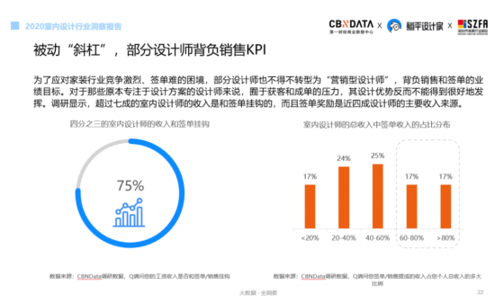 除了能“文”會(huì)“武”,在獲客難、簽單慢、競爭極其激烈的家裝行業(yè),部分設(shè)計(jì)師還背負(fù)著銷售的KPI,不得不被迫兼職“銷售”。CBNData《報(bào)告》顯示,有三成公司每成功獲得1個(gè)成單客戶背后要至少接觸6個(gè)以上潛在客戶。其中,超過七成的室內(nèi)設(shè)計(jì)師的收入與簽單率直接掛鉤,簽單獎(jiǎng)勵(lì)也是近四成設(shè)計(jì)師的主要收入來源。