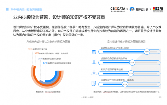 在國內(nèi)知識(shí)產(chǎn)權(quán)尚未得到完善保護(hù)的市場環(huán)境下,業(yè)內(nèi)抄襲較為普遍,設(shè)計(jì)師的知識(shí)產(chǎn)權(quán)不受尊重,原創(chuàng)作品常被“臨摹”,遭遇背叛的痛恨揮之不去,CBNData《報(bào)告》顯示,近八成設(shè)計(jì)從業(yè)者認(rèn)為國內(nèi)業(yè)內(nèi)抄襲十分普遍,國內(nèi)對(duì)知識(shí)產(chǎn)權(quán)的保護(hù)度(得分)僅為國外的一半,其中最重要的原因在于設(shè)計(jì)作品的知識(shí)產(chǎn)權(quán)難以界定。