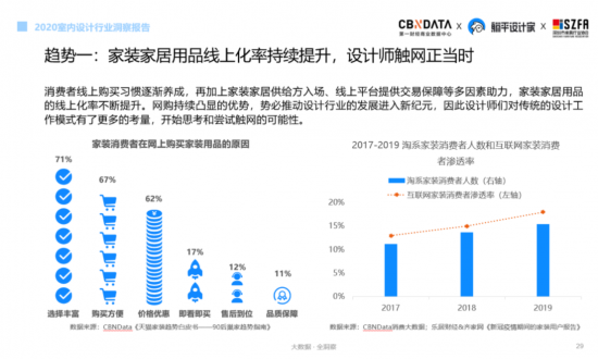 隨著家裝家居用品線上化率的持續(xù)提升,消費(fèi)者線上購買習(xí)慣逐漸養(yǎng)成,再加上家裝家居供給方入場、線上平臺(tái)提供交易保障等多因素助力,設(shè)計(jì)師們對(duì)傳統(tǒng)的設(shè)計(jì)工作模式有了更多的考量,開始思考和嘗試觸網(wǎng)的可能。