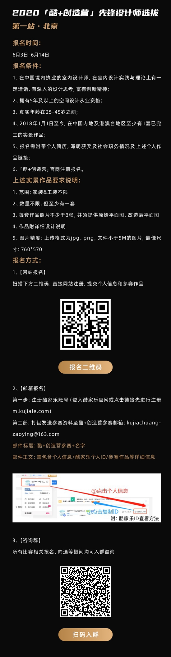 6月23日當(dāng)天,將由陳暄率先發(fā)布2020「酷+創(chuàng)造營(yíng)」首輪設(shè)計(jì)命題,面向全國(guó)范圍征集命題設(shè)計(jì)效果圖,無(wú)論你身在何處,無(wú)論你是設(shè)計(jì)小白或已頗有成就,只要有想法有能力,即可在酷家樂(lè)平臺(tái)進(jìn)行命題設(shè)計(jì)投稿。組委會(huì)將在所有命題設(shè)計(jì)投稿中進(jìn)行篩選,并最終選出5個(gè)作品交由導(dǎo)師親自點(diǎn)評(píng),并將在媒體平臺(tái)對(duì)優(yōu)秀作品及設(shè)計(jì)師多重曝光展示。