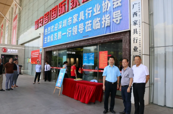 ▲深圳市家具行業(yè)協(xié)會侯克鵬主席、富安居集團董事葉健及廣西家具行業(yè)協(xié)會領導鄒家聲合影