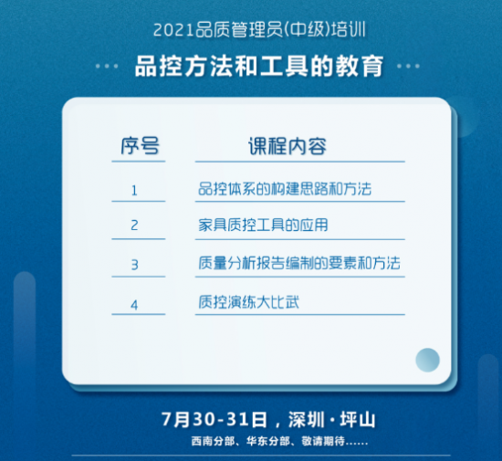 家具品質(zhì)管理(中級)培訓課程,則是賽德檢測團隊基于對行業(yè)和企業(yè)品控問題和方法長期卓絕的研究,并經(jīng)過一年多的細致打磨,才定于7月30-21日與大家見面。