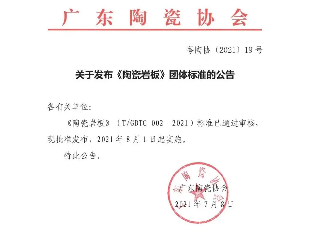 2021年7月,由廣東陶瓷協(xié)會牽頭組織,廣東新明珠陶瓷集團(tuán)等50多家單位參與編寫的《陶瓷巖板》(T/GDTC 002-2021)團(tuán)體標(biāo)準(zhǔn)經(jīng)審查、批準(zhǔn),于2021年7月8日正式發(fā)布,自2021年8月1日起實(shí)施。