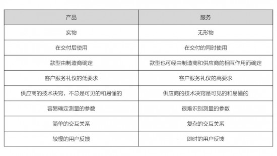 產(chǎn)品與服務(wù)在交付方式、交付形態(tài)以及用戶感知與體驗(yàn)上是全然不同的,這就需要在設(shè)計(jì)與生產(chǎn)過(guò)程中分別予以專業(yè)化運(yùn)作,詳見(jiàn)下表所列。