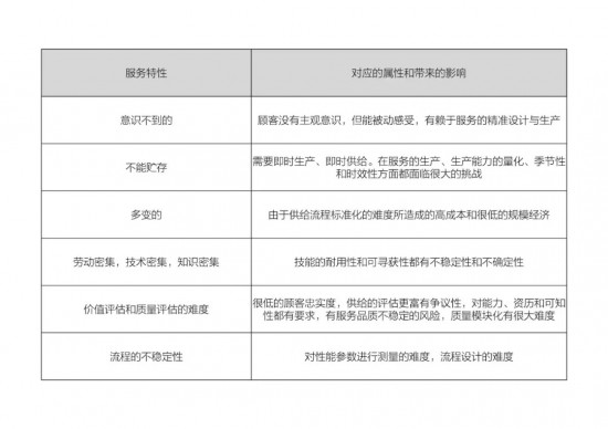 服務(wù)的特性與產(chǎn)品截然不同,對(duì)設(shè)計(jì)、生產(chǎn)與供給的方式都有著完全不同的要求,見(jiàn)下表所示。