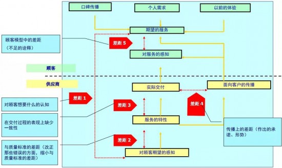 4)服務(wù)供給的模型與關(guān)鍵節(jié)點(diǎn) 下圖是服務(wù)供給的模型,在理解供給原理的基礎(chǔ)上,尤其要注意五個(gè)可能出現(xiàn)的差距點(diǎn),服務(wù)品質(zhì)主要是在這五個(gè)點(diǎn)上決定的,這樣工作上的著力點(diǎn)就清晰了。其中: