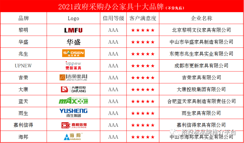 招投標供應(yīng)鏈品牌推介平臺為推動家具企業(yè)加強品牌建設(shè),提升品牌的知名度和美譽度,擴大家具品牌在政府采購市場的影響力。特舉辦了“2021 中國辦公及商用家具評價推介”活動,據(jù)悉,此活動受到業(yè)內(nèi)及社會各界人士的廣泛關(guān)注和熱情參與,參評展示家具知名品牌企業(yè) 510 余家,網(wǎng)絡(luò)公眾滿意度市場調(diào)查投票共達 829.3262萬余票。各參評企業(yè)數(shù)據(jù)由機構(gòu)推薦、企業(yè)自薦、大數(shù)據(jù)采集構(gòu)成,并由來自質(zhì)檢、環(huán)保、認證、行業(yè)協(xié)會等專家對各參評品牌企業(yè)進行了綜合評審,“黎明”、“華盛”、“更新”、“吉榮”、“海邦”等品牌憑借優(yōu)異的綜合實力在眾知名品牌中脫穎而出斬獲“2021政府采購辦公家具十大品牌”供應(yīng)商,展現(xiàn)了企業(yè)良好品牌形象,充分發(fā)揮品牌引領(lǐng)作用,引領(lǐng)行業(yè)向更健康、更環(huán)保、更生態(tài)方向發(fā)展。具體如下: