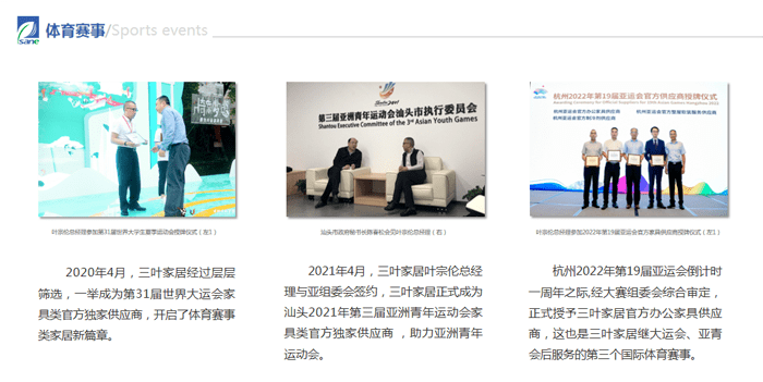 三葉在創(chuàng)建和發(fā)展民族品牌的同時(shí),將觸角延伸到國際體育賽事:成都2021年第31屆世界大運(yùn)會(huì)家具類官方獨(dú)家供應(yīng)商、亞奧理事會(huì)官方戰(zhàn)路合作伙伴、亞奧理事會(huì)官方獨(dú)家家居產(chǎn)品供應(yīng)商、亞奧理事會(huì)官方獨(dú)家體育場(chǎng)館座椅供應(yīng)商、亞洲運(yùn)動(dòng)智能家居生產(chǎn)基地、亞洲運(yùn)動(dòng)智能家居科技研發(fā)設(shè)計(jì)中心、杭州2022年第19屆亞運(yùn)會(huì)官方辦公家具供應(yīng)商、汕頭2021年第三屆亞青會(huì)家具類官方獨(dú)家供應(yīng)商。三葉產(chǎn)品將全方位用于大運(yùn)會(huì)、亞運(yùn)會(huì)、亞青會(huì)等國際體育運(yùn)動(dòng)賽事工程項(xiàng)目中。一個(gè)又一個(gè)的事業(yè)高峰,印證了三葉家具以及三葉人在打造民族品牌目標(biāo)中不斷努力進(jìn)取,在國際舞臺(tái)上成就卓越。