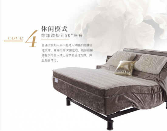 路福S301配備了兩個(gè)德國OKIN電機(jī),背部最高可抬升60°,腿部可抬升至40°,可以滿足多種躺臥姿勢(shì),滿足不同的需求,如閱讀、看電視、辦公、打鼾干預(yù)等。