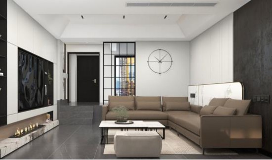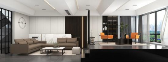 黑白灰的空間里加點亮色調(diào)和,客廳的整體基調(diào)更加和諧統(tǒng)一,臺階設(shè)計讓整體格局形成高低差觀感,更顯生動性與趣味性,劃分區(qū)域,同樣不失互動性。