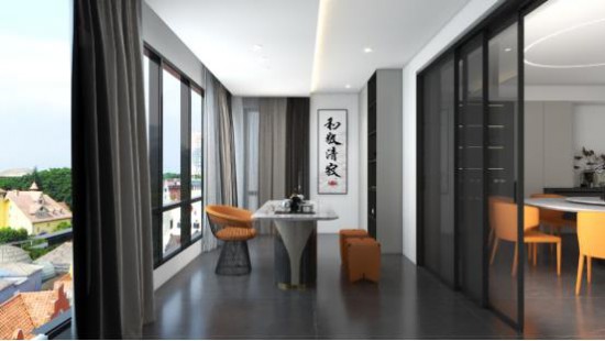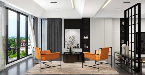 落地窗引景入室,兩張CBD家居·金豹 | J001單椅,愛馬仕橙色洋溢時尚氣息,構(gòu)型線條感十足,將藝術(shù)與實用性完美結(jié)合,穩(wěn)固性俱佳。風動簾,可靜坐望遠,享受愜意時光。