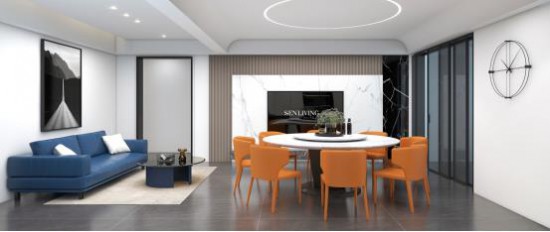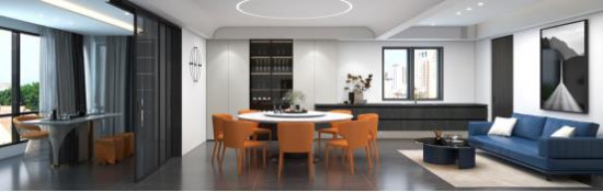 CBD家居· 黑金 | HG571餐桌,大理石圓桌面溫潤有型,演繹家的溫情,可旋轉(zhuǎn)圓盤設(shè)計增強實用性,橙色餐椅點綴,活躍用餐氛圍;CBD家居·黑金 | HZ089沙發(fā),藍色清雅十足,一字型靠墻排列,豐富空間美感和功能性。