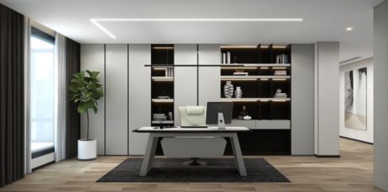 學習辦公區(qū)設(shè)計簡約,冷色調(diào)沉靜十足,定制柜體合理劃分,置物收納整潔有序,定制CBD家居·金豹 | J070辦公桌,觀感高級,更具實用性,符合居主的品味與生活習慣。