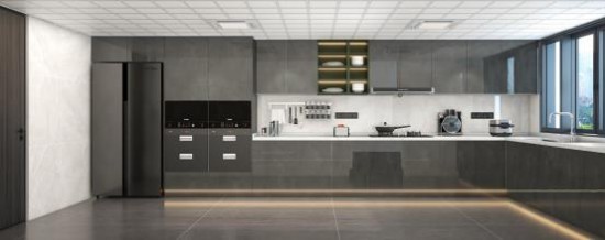 L型動線走向靈動自如,洗-切-煮一氣呵成。整體低調(diào)純粹的深灰色,提高空間質(zhì)感,櫥柜下方線燈設(shè)計,烘托出生活的溫馨與煙火氣。