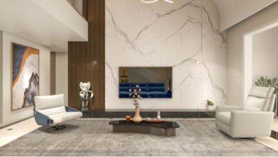 復(fù)式客廳挑高設(shè)計(jì)營造大氣質(zhì)感,灰色大理石電視背景墻搭配深木色格柵,自然靈動(dòng)的紋理,交織出溫潤雅致的空間意境,石與木相得益彰,演繹簡雅沖淡的藝術(shù)美學(xué)。